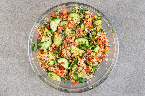Die Gurken und die Tomaten unter den restlichen Bulgur mengen. Aus 2EL Olivenöl, 2EL hellem Essig, dem restlichen Estragon und 1 kräftigen Prise Zucker ein Dressing anrühren und unter den Bulgursalat rühren, ggf. mit Salz und Pfeffer nachwürzen. Die gebackenen Pilze mit dem Bulgursalat anrichten und servieren.