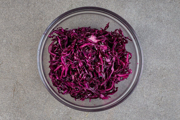 Die 1/2 des Rotkohls in feine Streifen schneiden, dabei den harten Strunk entfernen. Der übrige Kohl wird für dieses Rezept nicht benötigt. Den Rotkohl mit 2EL Pflanzenöl, 2EL Essig, 2TL Senf und 1TL Honig vermengen und mit Salz und Pfeffer abschmecken.