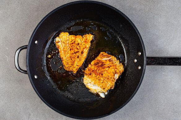 Den Fisch in einer mittelgroßen Pfanne mit 1EL Pflanzenöl bei mittlerer bis starker Hitze auf jeder Seite 1–2Min. braten, bis er gar ist, dann aus der Pfanne nehmen und ca. 5Min. ruhen lassen.