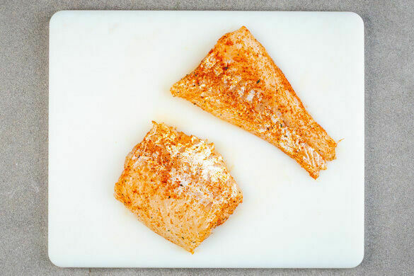 Den Backofen auf 240°C (220°C Umluft) vorheizen. Den Fisch von beiden Seiten mit insgesamt 1TL Gewürzmischung sowie je 1 Prise Salz und Pfeffer einreiben. Tipp: Wer es nicht so scharf mag, kann auch weniger Gewürzmischung verwenden.