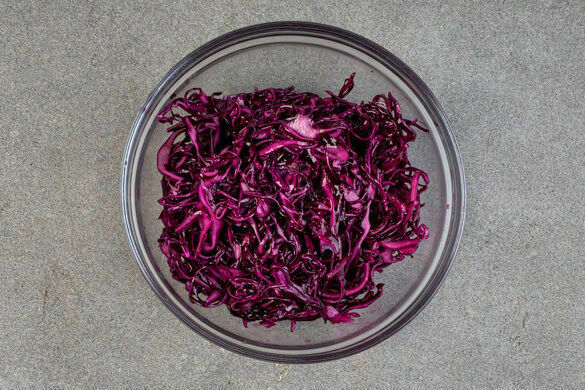 Den Rotkohl in feine Streifen schneiden, dabei den harten Strunk entfernen. Den Rotkohl mit 4EL Pflanzenöl, 2EL Essig, 4TL Senf und 2TL Honig vermengen und mit Salz und Pfeffer abschmecken.