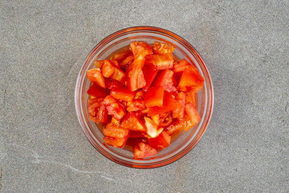 Die Tomaten grob würfeln. Die Limette halbieren, eine Hälfte auspressen, die andere Hälfte in Spalten schneiden. Die Tomaten mit dem Limettensaft vermengen und mit Salz und Pfeffer abschmecken.