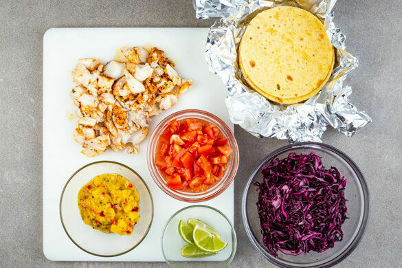 Den Fisch mit einer Gabel in mundgerechte Stücke zerteilen. Die Tortillas nach Belieben mit der 1/2 des Rotkohls, dem Fisch, den Tomaten und der Mangosalsa füllen. Den restlichen Rotkohl mit den Tacos servieren und die Limettenspalten dazu reichen.