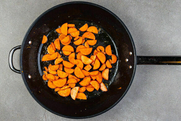 Den Backofen auf 240°C (220°C Umluft) vorheizen. 100g Butter bis zur Verwendung in Step 4 im Kühlschrank aufbewahren. Die Karotten ggf. schälen, längs halbieren und in dünne Scheiben schneiden. Die Karottenscheiben in einer großen Pfanne mit 2EL Butter und 1TL Salz bei mittlerer Hitze in ca. 5Min. weich braten.