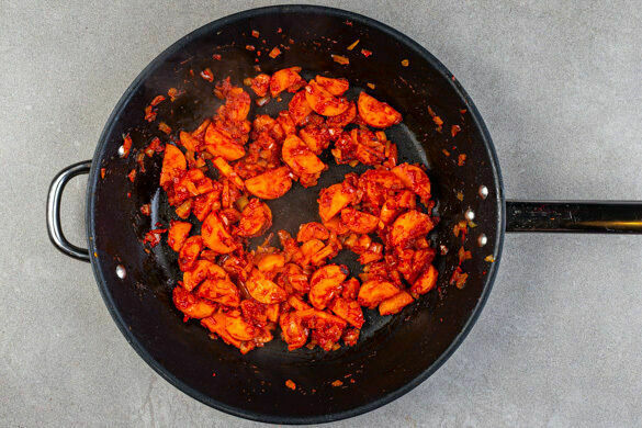 Die Zwiebel schälen, halbieren und fein würfeln. Die Zwiebelwürfel und das Tomatenmark in die Pfanne geben und unter Rühren ca. 5Min. mitbraten.