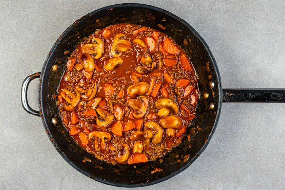 Die Pilze ggf. säubern und je nach Größe halbieren oder vierteln, dann mit dem Hackfleisch und 1TL Salz in die Pfanne zu dem Gemüse geben und bei sehr starker Hitze ca. 3Min. goldbraun anbraten. Die Hackfleisch-Mischung mit 2TL Mehl bestäuben. Die Gewürzmischung, 2EL Balsamicoessig, 350ml Wasser und 2TL Zucker einrühren und ca. 5Min. köcheln lassen.