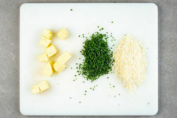 Den Schnittknoblauch in feine Ringe schneiden. Den Käse fein reiben. 100g Butter aus dem Kühlschrank nehmen und in kleine Würfel schneiden.