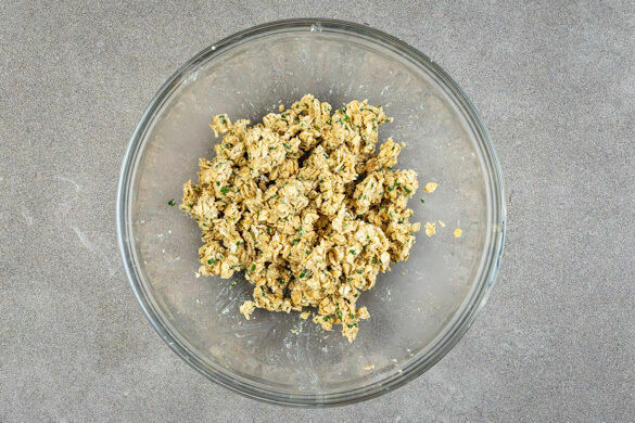 Den Käse mit 200g Haferflocken, 3/4 des Schnittknoblauchs, 2TL Backpulver, den Butterwürfeln, 2EL Mehl, 1 kräftigen Prise Salz und 1TL Pfeffer zu lockeren Krümeln verkneten. Tipp: Die übrigen Haferflocken zum Frühstück mit Joghurt und Früchten servieren.