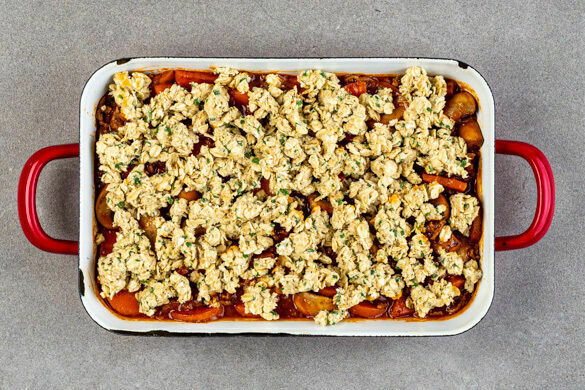 Das Ragout in eine mittelgroße Auflaufform geben und gleichmäßig mit den Crumble bestreuen. Im Ofen 12–14Min. backen, bis die Crumble appetitlich gebräunt sind. Das Ragout auf Teller verteilen, mit dem restlichen Schnittknoblauch garnieren und servieren.