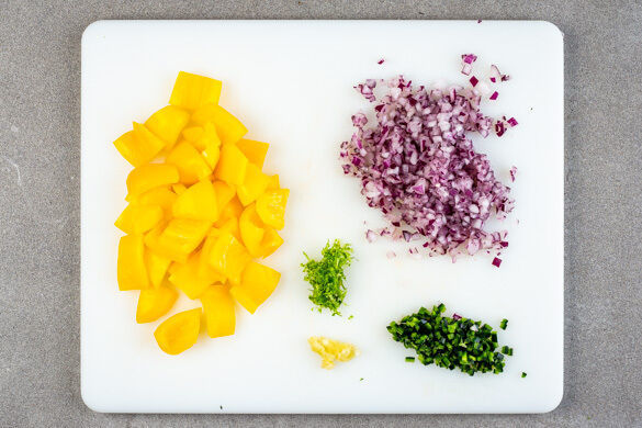 Das Fleisch aus dem Kühlschrank nehmen. Die Paprika vierteln, entkernen und in ca. 2cm große Würfel schneiden. Die Zwiebel und den Knoblauch schälen und fein würfeln. Die Chilischote längs halbieren und in feine Würfel schneiden. Tipp: Für weniger Schärfe die Kerne entfernen. Die Limettenschale abreiben, dann die Limette halbieren und auspressen.