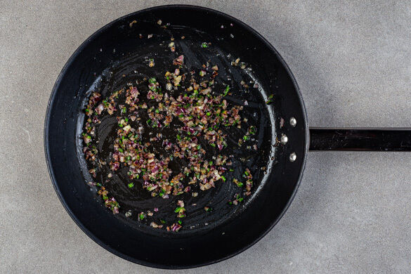 150ml Wasser in einem kleinen Topf aufkochen. Die Bohnen in einem Sieb abtropfen lassen, dabei mit einer Tasse die Bohnenflüssigkeit auffangen und in dem Topf mit dem Wasser verrühren. Die 1/2 der Zwiebeln und die Chilischote nach gewünschtem Schärfegrad in einer mittelgroßen Pfanne mit 1EL Butter bei mittlerer Hitze 2–3Min. anbraten.