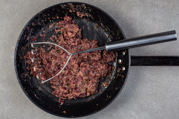 Die 1/2 des Kreuzkümmels einrühren und ca. 1Min. erhitzen. Die Bohnen und die 1/2 des Knoblauchs 1–2Min. mitbraten, dann 200ml Bohnenwasser mit 1/2TL Salz dazugeben und 8–10Min. köcheln lassen, bis die Flüssigkeit zur Hälfte verdampft ist. Die Pfanne vom Herd nehmen und die Bohnen grob stampfen. Das Bohnenmus mit Kreuzkümmel und Salz abschmecken. Abgedeckt warm halten.
