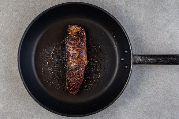 Das Fleisch trocken tupfen, mit Salz und Pfeffer würzen und in einer zweiten mittelgroßen Pfanne mit 1EL Olivenöl bei starker Hitze auf der Fettseite 2–4Min. scharf anbraten. Wenden und weitere 2–4Min. braten, je nach Dicke des Fleisches. Die Hitze reduzieren und das Fleisch 1–3Min. abgedeckt garen, je nachdem, ob es medium oder durch sein soll. Abgedeckt auf einem Teller ruhen lassen.